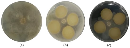 The addition of EEP to the sodium alginate film had effects at the two concentrations studied (5 and 10% w/v). Prepared sodium alginate films with EEP were 0.34 mm thick. Figure 5 shows that the control film had a radial growth of filamentous mold, while the 5 and 10% EEP films had no radial growth. No zones of inhibition were observed, but when the fungal microorganism came into direct contact with the active film, its growth stopped. Pastor et al. (2010) [] observed a similar effect with Penicillium italicum strains and hydroxy-propyl-methyl-cellulose films with propolis, as they did not observe antifungal effects. However, growth data indicated that composite films were effective in reducing microbial growth and that effectiveness increased with increasing propolis concentration, although complete inhibition of fungal growth was not possible for Penicillium italicum. On the other hand, antifungal effects were seen for Aspergillus niger strains at higher concentrations of propolis.