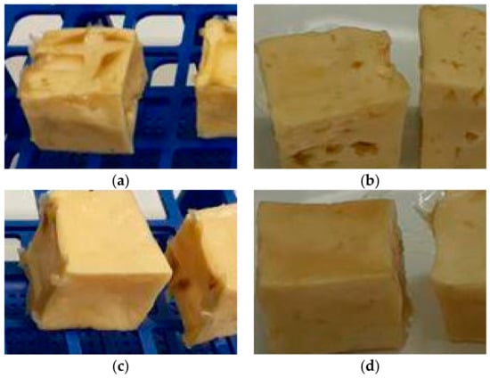 A solution of sodium alginate with EEP was prepared according to Section 2.4, but without the film formation step. The dip coating procedure was performed as described by Tabassum & Khan, (2020) [] with modifications. Once the mixture was made, fresh and ripened cheese was cut into 5 × 5 cm pieces. The coating was applied in two ways: immersing the pieces of fresh and ripened cheese in a container with a homogeneous mixture of the coating for 30 s; or painting the surface of the pieces of fresh and ripened cheese with a brush, covering their entire surface. Subsequently, the samples were left at room temperature (12 °C) for 30 days with a relative humidity of 85% for further evaluation. This stage was carried out in a preliminary manner, which will be extended in a new study, analyzing sensory and technological parameters in the product.