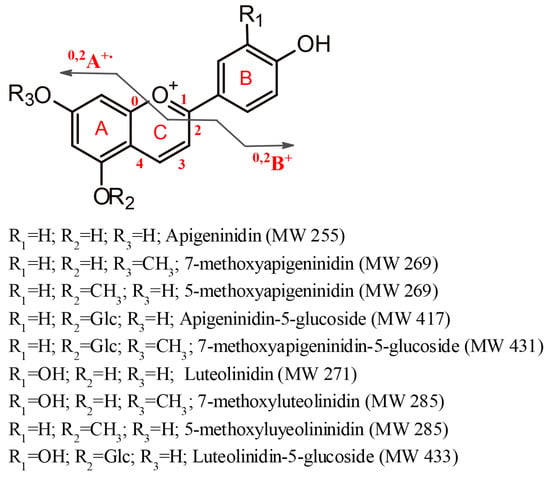Chemical structures and molecular weights of 3-DXA and derivatives present in red sorghum. Nomenclature and two characteristics fragment ions of anthocyanins are also illustrated in the figure.