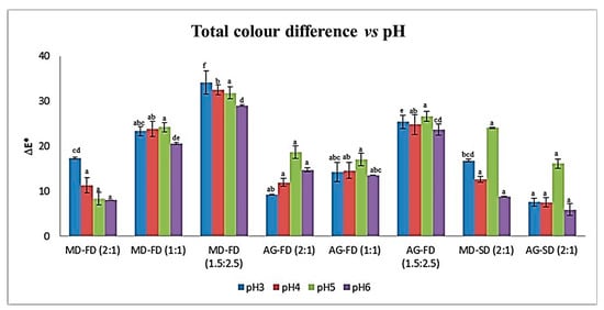 Figure 2 shows, for the different pH values, a significant difference (p < 0.05) in the total colour difference (ΔE*) of the encapsulated and non-encapsulated extract obtained for the two encapsulating agents and different ratios obtained by the two drying processes. The results indicated that the lowest ΔE* was obtained for the 2:1 ratio for both carrier agents and drying process, with no significant differences (p > 0.05) for pH 6. For the other ratios, the highest ΔE* was observed for the ratios (1.5:2.5) and showed significant differences (p < 0.05) for all pH values.