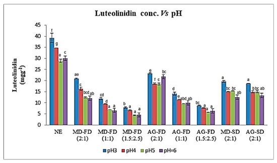 The concentration of luteolinidin (mg g−1) for the red dye extract non-encapsulated (NE) and extracts encapsulated with maltodextrin (MD) and Arabic gum (AG) obtained by freeze-drying (FD) and by spray-drying (SD) (mean ± SD), and dispersed at different pH values (3–6). Bars with the same letters are not significantly different at 5%.