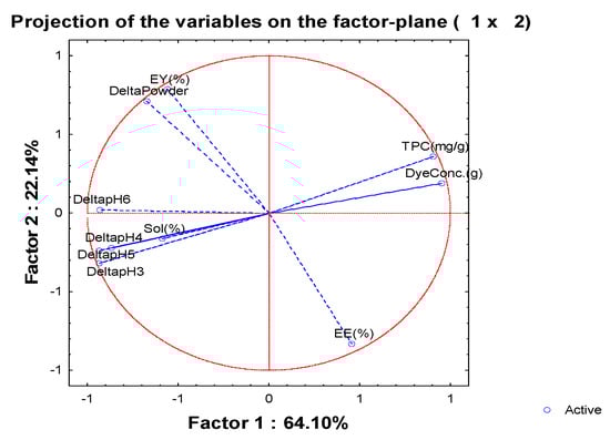 Principal component analysis with six active and four supplementary variables. Abbreviations: encapsulation efficiency (EE), encapsulation yield (EY), dye concentration (Dye Conc.), solubility (Sol), powder colour variation (Δ powder), colour variation at pH 3, pH 4, pH 5 and pH 6 (ΔE* pH 3, ΔE* pH 4, ΔE* pH 5 and ΔE* pH 6).