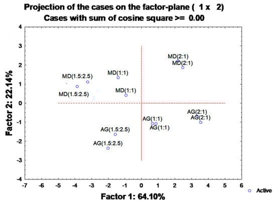 A PCA based on the correlation matrix was performed to allow a better understanding of the interactions between the two encapsulating agents used (maltodextrin and Arabic gum) and the ratio between the compounds to be encapsulated (3-DXA). In the first approach, all ten parameters were included as active variables, and then those factors exhibiting coordinates results of the linear combination of the six active and four supplementary variables, explaining 64.10% and 22.13%, respectively (Figure 4), and corresponding to 86.23% of the total variance. The first principal component was positively correlated with the dye concentration (Dye Conc. (0.95)) and the TPC (0.91); and negatively with a colour variation in the released compounds from microparticles at different pHs, ΔE* pH 3 (−0.93) and ΔE* pH 4 (−0.86), and ΔE* pH 5 (−0.94) and ΔE* pH 6 (−0.93), in line with the previous correlation data. The second component was positively highlighted by the ΔE* powder colour (0.71) and the EY (0.78) indicating that the colour has been retained after processing, and negatively by EE (−0.83). The Dye Conc. and TPC variance were distributed between the two components. Grouping the material type (maltodextrin and the Arabic gum) with the ratio and the active agent (Figure 5) we can observe differences. Based on the first component, the 2:1 ratio, on the right side with higher EY and ΔE* powder colour, parameters are separated from the other carrier agent ratios (1:1 and 1.5:2.5 (w/w)) located on the left side with Dye Conc. and TPC.