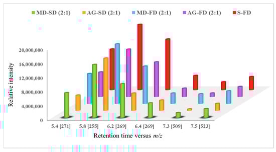 Comparative diagram of the relative abundances of 3-DXA present in the red dye extract non-encapsulated extracts (S-FD) and extracts encapsulated with maltodextrin (MD) and Arabic gum (AG) obtained by freeze-drying (FD) and by spray-drying (SD).