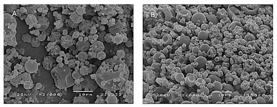 SEM images of sorghum microparticles obtained with spray-drying by maltodextrin (A) and Arabic gum (B), (magnification 2000×).