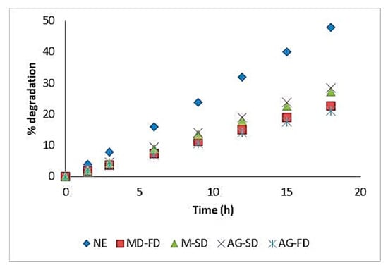 Degradation (%) kinetics in function of time (hours) for the red dye extract non-encapsulated (NE) and extracts encapsulated with maltodextrin (MD) and Arabic gum (AG) obtained by freeze-drying (FD) and by spray-drying (SD) (mean ± SD), at 80 °C.