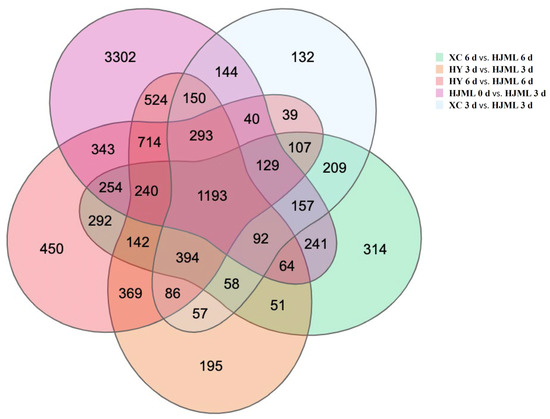 Venn diagram of differentially expressed genes between peach cultivars ‘HJML’, ‘HY’, and ‘XC’. ‘XC’ represents ‘Xia Cui’, ‘HY’ represents ‘Hua Yu’, and ‘HJML’ represents ‘Hujing Milu’.
