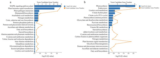 The upregulated genes were annotated in the GO database and were categorized into twenty-eight functional groups, including thirteen in biological processes, eight in cellular components, and seven in molecular functions (Supplementary File S5). Furthermore, the 159 upregulated genes were then annotated in the KEGG pathway database, and the top 20 most highly enriched pathways are shown in Figure 2a. Remarkably, 14 upregulated genes were found in the mitogen-activated protein kinase (MAPK) signaling pathway-plant (ko04016) and 13 genes were found in the plant hormone signal transduction pathway (ko04075); the other 18 pathways are listed in Figure 2a. The 365 downregulated genes were classified into twenty-six functional groups in the GO database, including eleven in biological processes, ten in cellular components, and five in molecular functions (Supplementary File S5). Photosynthesis was the most highly enriched of the pathways, and the top 20 most highly enriched pathways are shown in Figure 2b. The fold change and function annotation based on the reference genome of upregulated genes in the top five enriched pathways are shown in Table 1, while the corresponding downregulated genes are shown in Table 2. The 14 upregulated genes in the MAPK signaling pathway-plant (ko04016) and the 13 upregulated genes in the plant hormone signal transduction (ko04075) pathway were associated with ethylene biosynthesis and signal transduction, which may participate in fruit softening and senescence process. The BGI_novel sequence is listed in Supplementary File S6.