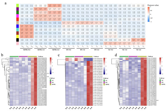 Weighted gene co-expression network analysis. (a) Correlation analysis between co-expression gene modules and phenotype. (b–d) Heatmaps of co-expression network analysis of stage-specific modules by RNA-Seq data: b represents the green module, c represents the magenta module, and d represents the red module. ‘XC’ represents ‘Xia Cui’, ‘HY’ represents ‘Hua Yu’, and ‘HJML’ represents ‘Hujing Milu’.