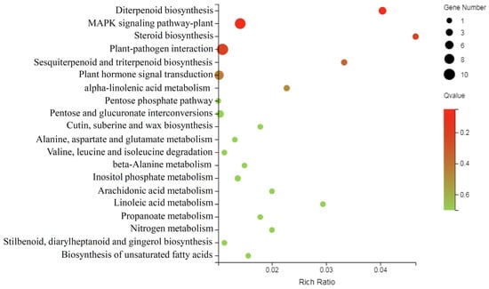 WGCNA was carried out to identify the hub genes regulating peach fruit softening and senescence. The M-type peach fruit released a larger amount of ethylene and softened noticeably after harvest, whereas the fruit from the two SH-type peach cultivars was characterized by their low ethylene production and very firm during ripening (both on- and off-tree) [20,25]. In Figure 3, the green, red, and magenta modules with the highest phenotypic correlations were selected for further analysis based on fruit ethylene production after harvest. A total of 115 genes were identified in three modules and were annotated in the KEGG database. The pathways of diterpenoid biosynthesis, the MAPK signaling pathway-plant, steroid biosynthesis, plant–pathogen interaction, sesquiterpenoid and triterpenoid biosynthesis, and plant hormone signal transduction were all highly enriched (Figure 4). Ethylene plays a central role in fruit softening and senescence, with the MAPK signaling pathway-plant also being associated with ethylene biosynthesis [36,37]. Nine genes in the MAPK signaling pathway-plant and seven genes in the plant hormone signal transduction pathways were identified for further study, while fourteen and thirteen genes were also identified by Venn diagram analysis in the MAPK signaling pathway-plant and plant hormone signal transduction pathway, respectively. We have reasons to believe that genes in the above two pathways may participate in the process of the regulation of fruit softening and senescence through ethylene biosynthesis and/or signal transduction. A total of 20 candidate genes were identified for further analysis.