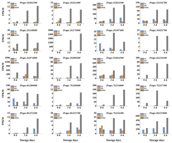 The gene expression levels of the 20 candidate genes were identified by Venn diagram analysis and the WGCNA method, and the gene expression level was analyzed by RNA-seq technology (Figure 5). The expression levels of the 20 candidate genes were higher during room temperature storage in the M-type peach ‘HJML’ than in SH peach ‘XC’ and ‘HY’. Significantly, the gene PpACS1 (Prupe.2G176900) plays a crucial role in ethylene synthesis, and its suppressed expression was associated with a low level of ethylene production, resulting in the suppression of fruit softening in SH peach cultivars [38]. Interestingly, 12 genes showed similar expression patterns to PpACS1 between the M-type peach ‘HJML’ and the SH-type peach cultivars (‘XC’ and ‘HY’), namely Prupe.1G034300, Prupe.1G042500, Prupe.1G526700, Prupe.3G024700, Prupe.3G074800, Prupe.3G098100, Prupe.5G054500, Prupe.7G160600, Prupe.7G234800, Prupe.8G153100, Prupe.8G153700 and Prupe.8G153800. The expressions of Prupe.1G412400, Prupe.2G140600, Prupe.2G307400, Prupe.6G226100, Prupe.6G286000, Prupe.7G244300, and Prupe.7G247500 increased at 3 d of postharvest storage in the M-type peach ‘HJML’ but declined by the end of storage (Figure 5). The FPKM and functional annotations of these 20 candidate genes related to softening and senescence are listed in Supplementary File S7.