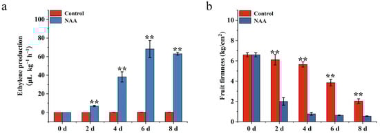 Ethylene production and fruit firmness analysis of ‘XC’ peach fruit after NAA treatment during room-temperature storage. (a) Ethylene production. (b) Fruit firmness. The X-axis represents the days of storage after harvest. Data are means ± SEs (n = 3), and significant differences (p < 0.01) by Student’s t-test between means are indicated by the symbol **.