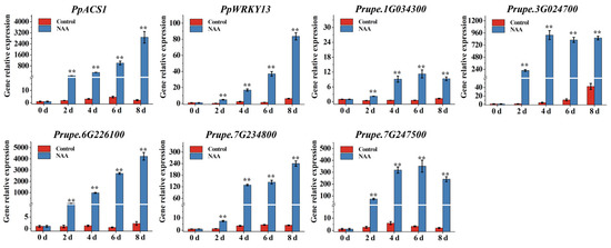 SH-type peach fruit can be induced to release a large amount of ethylene and achieve rapid softening in response to NAA treatment. In the present study, the SH-type peach cultivar ‘XC’ was used to analyze the candidate gene expression after NAA treatment. The control ‘XC’ fruit maintained fruit firmness (0–4 d), and hardly synthesized any ethylene during room temperature storage (Figure 6), whereas the firmness of fruit treated with NAA declined markedly after two days and retained a significantly lower firmness than that of the control fruit during storage. Ethylene production of ‘XC’ fruit was induced by NAA treatment after two days, with a pattern of increased production during storage (Figure 6). Generally, after NAA treatment, the SH-type cultivar ‘XC’ exhibited softening characteristics similar to those of M-type peach; thus, these materials would be extremely suitable for the identification of candidate genes associated with fruit softening and senescence. The expression levels of the 20 candidate genes identified earlier as being related to softening and senescence were analyzed by RNA-Seq using SH-type peach ‘XC’ with NAA treatment (FPKM data were listed in Supplementary File S8). Expression levels of seventeen of the twenty genes in ‘XC’ fruit during room temperature storage were altered in response to NAA treatment, whereas those of the remaining three genes (Prupe.2G140600, Prupe.2G307400, Prupe.6G286000) were not affected by NAA treatment (Figure 7). Of the seventeen genes, six genes, namely Prupe.1G042500, Prupe.1G412400, Prupe.7G160600, Prupe.7G244300, Prupe.8G153100, and Prupe.8G153700, exhibited lower expression levels, whereas four genes (Prupe.1G526700, Prupe.3G074800, Prupe.5G054500, and Prupe.7G244300) in ‘XC’ peach fruit were slightly upregulated by NAA treatment. On the other hand, the expression levels of seven genes (Prupe.1G034300, PpACS1, Prupe.3G024700, Prupe.3G098100 (PpWRKY13), Prupe.6G226100, Prupe.7G234800, and Prupe.7G247500) were strongly induced and significantly upregulated in ‘XC’ peach fruit treated with NAA in comparison with control ‘XC’ fruit. Furthermore, qRT-PCR of these seven genes showed that they are strong candidates for genes positively associated with peach fruit softening and senescence (Figure 8).