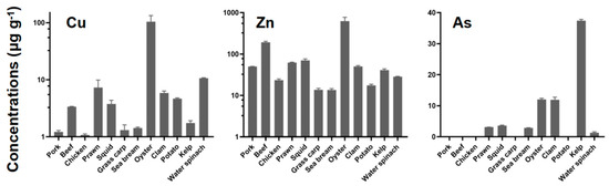 Among all the food ingredients tested, oysters revealed markedly higher Cu and Zn concentrations (104 ± 29 μg g−1 and 625 ± 149 μg g−1) than the other ones (Figure 1). Oysters are renowned for their excellent metal accumulation ability. In metal-polluted estuaries, oysters can accumulate Cu and Zn to rather high levels (4966 μg g−1 and 4897 μg g−1, respectively) [33], much higher than the levels observed in the present study. As was detected in only seven food ingredients, most of which were seafood. Previous studies have reported that seafood generally contains higher levels of As than food from freshwater and land, which could pose a risk to human health [34]. Kelp revealed the highest As concentrations (37 ± 0.4 μg g−1) in the present study. High concentrations of As (44 μg g−1) in seaweeds was also observed in previous studies [3], indicating that seaweeds have a strong ability to accumulation As.