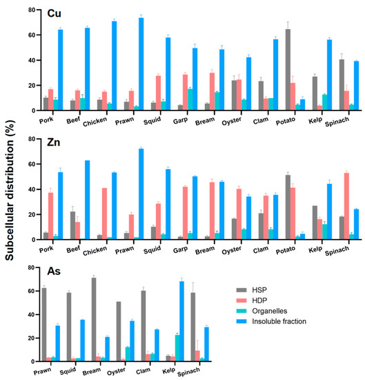 The subcellular distribution was element-specific. Cu and Zn were dominantly distributed in the insoluble fraction and HDP, while As was mainly found in HSP (Figure 2). Earlier studies in marine fishes and bivalves showed that Cu and Zn were predominantly associated with the insoluble fraction, while As was mainly associated with HSP [23,24], which is consistent with the present studies. However, the Cu and Zn distribution in potatoes (mainly in HSP) and the As distribution in kelp (mainly in the insoluble fraction) were different from the other food ingredients.