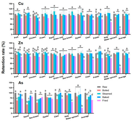 The retention rate of Cu, Zn, and As in food ingredients. Data are expressed as means ± SD (n = 3). Different letters (a, b, c, d) represent significant differences among treatments (p < 0.05).