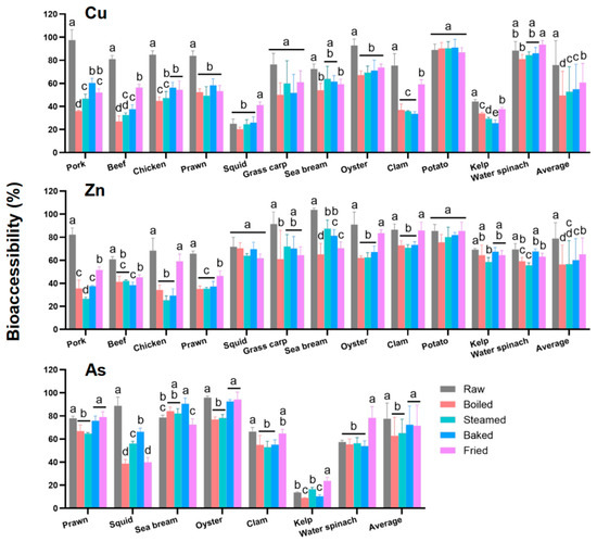 In brief, the average bioaccessibility of Cu and Zn in cooked ingredients (49–61% and 56–65%, respectively) was significantly lower than that in raw ingredients (76% and 79%) (p < 0.05). No significant difference was observed in As bioaccessibility between raw, baked, and fried ingredients (77%, 72%, and 71%, respectively), while the values slightly decreased after boiling and steaming (63% and 65%, respectively).