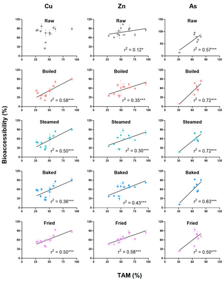 The correlation between trophically available metals (TAM) and the bioaccessibility of Cu, Zn, and As in food ingredients. TAM: organelles + HDP + HSP. The asterisk indicates there is a significant correlation (*: p < 0.05; ***: p < 0.001).