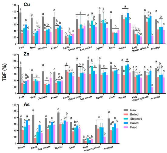 In general, the TBF of Cu, Zn, and As in all the tested food ingredients rank in the following order: raw (76–80%) > steaming and baking (50–62%) > boiling and frying (41–50%).