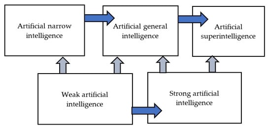 AI can be classified as weak or strong based on its stage of evolution. Weak AI is equivalent to artificial narrow and general intelligence [10,14], while strong AI is a more ambitious version of AI. Fjelland (2020) notes that although general artificial intelligence is classified as weak AI, it is a step closer to strong AI and can also be classified as such [10] (see Figure 1).