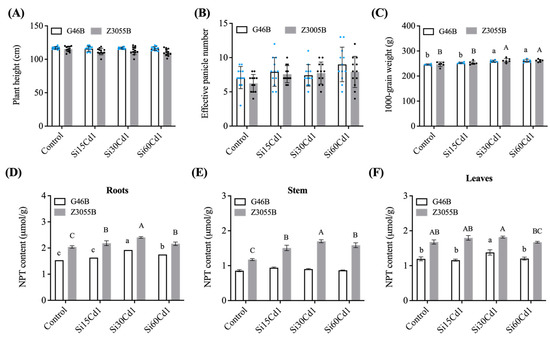 The results demonstrated that under Cd stress, basal fertilizer application of Si was beneficial in the combination of rice NPT and heavy metal ions, offering a detoxification mechanism against Cd stress. The contents of NPT in roots, stems and leaves of non-Se-enriched rice G46B and Se-enriched rice Z3055B were presented in Figure 1D–F. Under Cd pollution, Si treatment significantly enhanced the bioavailability of NPT in Se-enriched rice roots, stems, and leaves, leading to a significant increase in NPT content in each part. However, this biofortification effect was not as pronounced in non-Se-enriched rice.