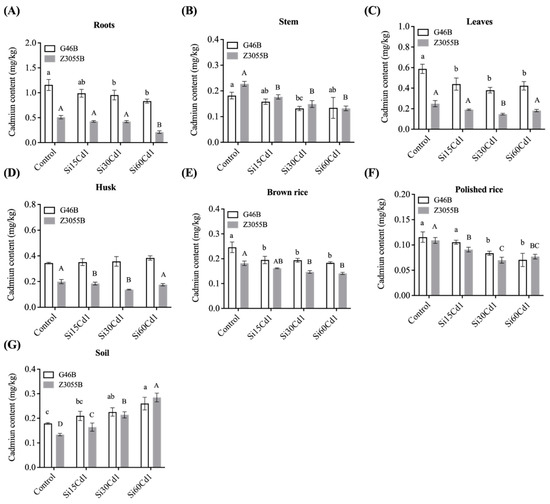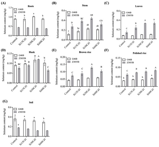 Cadmium content in various parts of soil and two different genotypes of rice. (A–G) Cadmium content in roots, stem, leaves, husk, brown rice, polished rice and soil of non-Se-enriched rice G46B and Se-enriched rice Z3055B, respectively. Data are mean ± SEM, n = 3 samples. Lowercase letters indicate significant differences in non-Se-enriched rice G46B (p < 0.05); Capital letters indicate significant differences in Se-enriched rice Z3055B (p < 0.05).