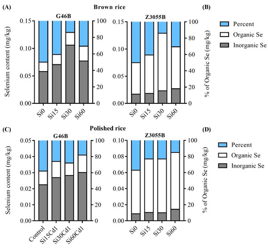 Interestingly, at the Si treatment of 30 mg/kg, the maximum percentage of organic Se was achieved, with values of 78.4% (G46B) and 87.1% (Z3055B), respectively. This finding suggests that 30 mg/kg was the optimal Si concentration treatment for achieving the highest organic Se content in polished rice, regardless of its Se-enrichment status (Figure 4C,D).