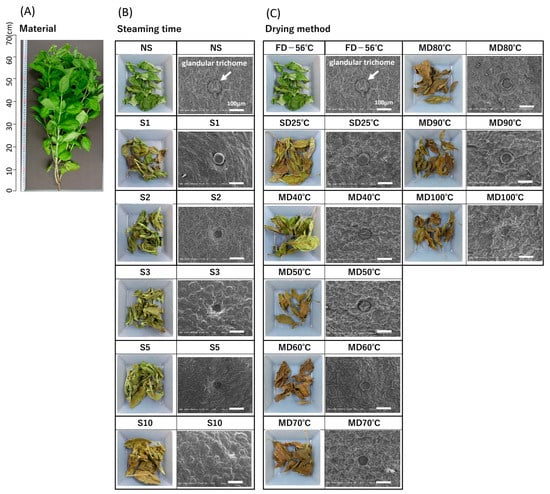 Digital camera and SEM images of Ocimum basilicum cv. ‘Genovese’. (A) Experimental material, (B) dried leaves with different steaming times, and (C) drying methods. FD: Freeze-drying (‒56 °C, 48 h), NS: Non-Steaming, S1: Steaming for 1 min, S2: Steaming for 2 min, S3: Steaming for 3 min, S5: Steaming for 5 min, S10: Steaming for 10 min, SD: Shade-drying (25 °C, 7 days), MD 40 °C: Machine-drying at 40 °C, MD 50 °C: Machine-drying at 50 °C, MD 60 °C: Machine-drying at 60 °C, MD 70 °C: Machine-drying at 70 °C, MD 80 °C: Machine-drying at 80 °C, MD 90 °C: Machine-drying at 90 °C, and MD 100 °C: Machine-drying at 100 °C.