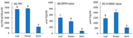 TPC, DPPH, and H-ORAC values of parts of Ocimum basilicum cv. ‘Genovese’. TPC: Total polyphenol content, DPPH value: DPPH radical scavenging activity value, H-ORAC value: Hydrophilic oxygen radical absorbance capacity value. The values are expressed as the standard reagents equivalent per dry weight. The results were obtained using Tukey’s test for multiple comparisons. Different letters indicate significant differences at p < 0.05. Data are expressed as mean ± SE (n = 6).