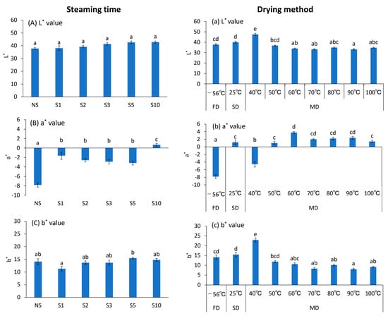 Effects of different treatment conditions on the color of Ocimum basilicum cv. ‘Genovese’ tea. (A,a) L* values, (B,b) a* values, and (C,c) b* values. FD: Freeze-drying (‒56 °C, 48 h), NS: Non-Steaming, S1: Steaming for 1 min, S2: Steaming for 2 min, S3: Steaming for 3 min, S5: Steaming for 5 min, S10: Steaming for 10 min, SD: Shade-drying (25 °C, 7 days), MD 40 °C: Machine-drying at 40 °C, MD 50 °C: Machine-drying at 50 °C, MD 60 °C: Machine-drying at 60 °C, MD 70 °C: Machine-drying at 70 °C, MD 80 °C: Machine-drying at 80 °C, MD 90 °C: Machine-drying at 90 °C, and MD 100 °C: Machine-drying at 100 °C. All results were obtained by Tukey’s test for multiple comparisons. Different letters indicate significant differences at p < 0.05. Data are expressed as mean ± SE (n = 6).