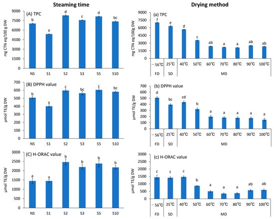 Figure 4 presents the results of TPC (A, a), DPPH value (B, b), and H-ORAC value (C, c). S treatment for ≥ 2 min resulted in significantly higher TPC, DPPH, and H-ORAC values compared with NS, which were 7040.2 ± 66.4 mg CTN eq/100 g DW, 508.4 ± 16.4 µmol TE/g DW, and 1448.8 ± 149.2 µmol TE/g DW, respectively. S2 values were 8319.3 ± 98.2 mg CTN eq/100 g DW, 598.2 ± 16.5 µmol TE/g DW, and 2466.6 ± 161.0 µmol TE/g DW, which were approximately 1.2, 1.2, and 1.7 times higher than NS, respectively. S1 values were significantly lower relative to NS for TPC and DPPH, and no significant difference was observed for H-ORAC. Above S2, the inactivation of polyphenol oxidase (PPO), which is a polyphenol-degrading enzyme, occurs, and a decrease in polyphenols during the lyophilization process is suppressed. It is assumed that S1 prolonged the rise in the leaf temperature, PPO inactivation was incomplete, and polyphenol content and antioxidant properties were not retained during the drying process. Among the different drying methods, FD showed the highest TPC and DPPH values (Figure 4a,b), whereas H-ORAC values were similar among FD, SD, and MD 40 °C (p > 0.05; Figure 4c). FD showed the best results in terms of quality preservation effects, such as composition and color []. However, the present study revealed that the H-ORAC activity of low-cost SD and MD 40 °C is comparable to that of FD. Although SD and MD 40 °C were minutely inferior to FD, they can maintain high values of TPC and DPPH (Figure 4a,b). During MD, all assays showed significantly lower values at 50 °C compared with that at 40 °C and a further significant decrease in activity at 60 °C compared with that at 50 °C (p < 0.05) (Figure 4a–c). Significant differences were not observed in any of the assays at drying temperatures > 60 °C (p < 0.05). PPO possibly remained active during drying because S treatment was not performed. Antioxidant properties were reduced due to oxidation reactions with PPO between 50–80 °C with respect to its active temperature range []. However, PPO activity is unlikely in drying treatments > 90 °C, and the decrease in its values may be primarily attributed to oxidation reactions. However, to determine this, it is necessary to measure the PPO activity value. These results indicate that S2 and drying at a temperature of ≤40 °C (FD, SD, or MD) is optimal for maintaining the antioxidant properties of Genova.