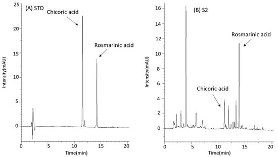 HPLC chromatograms of (A) rosmarinic and chicoric acids reagent and (B) S2: Steaming for 2 min.