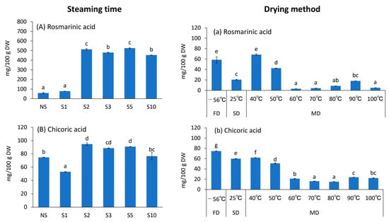 Effects of different treatment conditions on (A,a) rosmarinic and (B,b) chicoric acid contents of Ocimum basilicum cv. ‘Genovese’ tea. FD: Freeze-drying (‒56 °C, 48 h), NS: Non-Steaming, S1: Steaming for 1 min, S2: Steaming for 2 min, S3: Steaming for 3 min, S5: Steaming for 5 min, S10: Steaming for 10 min, SD: Shade-drying (25 °C, 7 days), MD 40 °C: Machine-drying at 40 °C, MD 50 °C: Machine-drying at 50 °C, MD 60 °C: Machine-drying at 60 °C, MD 70 °C: Machine-drying at 70 °C, MD 80 °C: Machine-drying at 80 °C, MD 90 °C: Machine-drying at 90 °C, and MD 100 °C: Machine-drying at 100 °C. The values are expressed as the standard reagents equivalent per dry weight. The results were obtained using Tukey’s test for multiple comparisons. Different letters indicate significant differences at p < 0.05. Data are expressed as mean ± SE (n = 4).