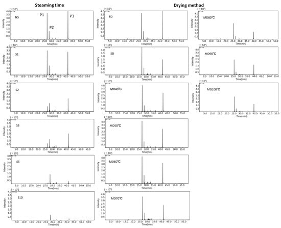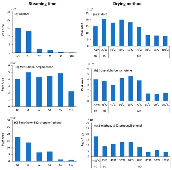 GC-MS chromatograms of the samples with respect to their treatment are shown in Figure 7. In this study, the number of volatile components detected varied from 42 to 92, depending on the treatment. There were three particularly large peaks (P1, P2, and P3) in Figure 7: P1 was presumed to represent Linalool, a monoterpene present in the aroma components of various fruits, vegetables, spices, coffee, and tea. It is used in cosmetics as a floral perfume, and in confections and soft drinks, because of its lily-like aroma. P2 was presumed to represent trans-alpha-bergamotene, which is an aromatic component of Bergamotene with a partially different bonding and atom arrangement. P3 was assumed to be 2-methoxy-3-(2-propenyl)-phenol, a type of phenolic. All three components have been previously reported in basil [,]. Figure 8 depicts the change in peak areas (PA) of Linalool, trans-alpha-bergamotene, and 2-methoxy-3-(2-propenyl)-phenol with each treatment. During S treatment, the PA of Linalool and 2-methoxy-3-(2-propenyl)-phenol decreased with increasing steam-heating time compared with that during NS, with a remarkable decrease observed > 2 min (Figure 8A,C). The PA of trans-alpha-bergamotene was not affected by S treatment, and its duration and showed a remarkable decrease only at S10 (Figure 8B). In some herbs, such as basil, destruction of the glandular trichome and reduction of aromatic compounds have been reported with steam-heat treatment. In this study, SEM images also confirmed the destruction of the glandular trichome at S2 and above (Figure 1A). The glandular trichome is filled with aromatic compounds unique to each plant species. Linalool and 2-methoxy-3-(2-propenyl)-phenol were assumed to have undergone oxidation and hydrolysis reactions [] and evaporation [] after the destruction of the glandular trichome, resulting in a decreased PA. On the contrary, trans-alpha-bergamotene, which was less affected by S treatment, did not show a decrease in PA even at S5, indicating that it is less prone to chemical reaction and evaporation after glandular trichome destruction compared with other components. The highest PA values for drying methods and temperature were different during SD for Linalool, MD 60 °C for trans-alpha-bergamotene, and FD for 2-methoxy-3-(2-propenyl)-phenol. However, a common trend was observed for all three components, with a marked decrease in PA above MD 80 °C and approximately the same value from 80 °C to 100 °C (Figure 8a–c). SEM images showed the destruction of the glandular trichome at S2. However, it remained unchanged, albeit in a deformed state, during MD, even at 100 °C. Since the S treatment involved FD, the heating time was the same as the S treatment time. Therefore, the maximum heating time for S treatment is 10 min. On the contrary, the heating times for MD 80 °C, 90 °C, and 100 °C were 45, 26, and 22 min, respectively, which were longer than those for the S treatment. Therefore, the volatile components of the glandular trichome could have decreased due to the high temperature and prolonged heating time, even without disruption. Trans-alpha-bergamotene was less affected by the S treatment than the other two components; however, PA was greatly reduced at S10 (Figure 8B). Therefore, trans-alpha-bergamotene is less prone to chemical reactions than Linalool, 2-methoxy-3-(2-propenyl)-phenol but volatilizes or decomposes under high temperature and prolonged heating. Linalool maintained levels similar to those seen during FD of up to MD 70 °C in the absence of glandular trichome disruption. 2-methoxy-3-(2-propenyl)-phenol was the most sensitive to heat among the three components since it decreased at SD and MD 40 °C even without glandular trichome disruption. Therefore, the S treatment should be limited to NS or steaming of 1 min, with respect to retaining aromatic components, whereas FD is the preferred drying method carried out at the right temperature to retain all three components. Therefore, MD ≤ 70 °C should be used for retaining two components (Linalool, trans-alpha-bergamotene).
