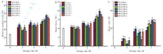 To evaluate the effect of O2 concentrations (5%, 20%, 35%, 50%, 65%, 80%, 95%) on the shelf life of D. rubrovolvata, the shear force, relative conductivity, and decay rate were employed. According to Figure 1, the relative conductivity, shear force, and decay rate of all samples increased over its shelf life. In the first three days of storage, all three indicators of samples in a high O2 (95%, 50%, 65%) environment were close to the initial value. However, with the storage time extended, the three indicators of samples in a low O2 environment were significantly lower than those in a high O2 environment. On the seventh day, the relative conductivity, shear force, and decay rate of samples under a 5% O2 environment were 26.91%, 8.20 ± 0.19 N, and 17.67%, respectively, which were 19.77%, 17.98%, and 33.75% lower, respectively, than ones at 95% O2/5% N2 (p < 0.05). The above result suggested that a low O2 concentration (5%) was more efficient at inhibiting the changes in the relative conductivity, shear force, and decay rate during the shelf life of fresh-cut D. rubrovolvata. The results of Li and Lyn’s papers confirm the same findings [32,33].