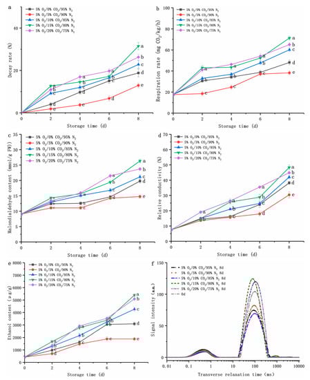 Effect of CO2 concentration (%) with 5% O2 on decay rate (a), respiration rate (b), malondialdehyde content (c), relative conductivity (d), ethanol content (e), and transverse relaxation time (f) of fresh-cut Dictyophora rubrovolvata. Differences at p < 0.05 are indicated by different letters and data are expressed as the mean ± SD.