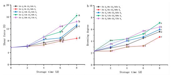 Subsequently, we evaluated the fresh-cut D. rubrovolvata samples’ texture and browning degree due to the different CO2 treatments (0%, 5%, 10%, 15%, or 20%) (Figure 3). The shear force and browning degree during shelf life significantly increased due to a higher CO2 concentration. Wang et al. [36] found that with the extension of storage time, under the condition of low O2 and high CO2, the hardness of the Pleurotus eryngii showed an increasing trend, which was consistent with our research. The reason for this phenomenon is that cutting and low-temperature storage increase the lignin content of edible mushrooms, leading to an increase in hardness [36]. The texture is the main attribute responsible for consumers’ acceptance of fresh-cut D. rubrovolvata. During the first two days of storage, the shear force of fruiting bodies in each treatment showed no significant change (p < 0.05) (Figure 3a). On the eighth day of shelf life, the shear force of the fruiting body in the 5% O2/5% CO2/90% N2 group increased from 5.72 ± 0.53 N at day 0 to 8.79 ± 0.55 N, significantly lower than other storage environments (12.68 ± 0.62 to 16.43 ± 0.75 N) (p < 0.05). From the results of the MDA and relative conductivity (Figure 2c,d), we concluded that an appropriate gas environment could inhibit the accumulation of the lignin, and thus the increase in shear force was delayed (Figure 3a).
