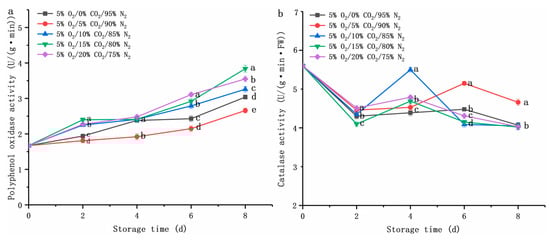 Nevertheless, it is worth noting that the CAT activity of the samples first decreased, then increased, and finally decreased over the shelf life (Figure 4b). Over the course of the shelf life, the CAT activity of samples in a higher CO2 storage environment (10%, 15%, or 20%) reached the maximum on the fourth day and then decreased. However, the CAT activity of samples under 5% O2/0% CO2/95% N2 and 5% O2/5% CO2/90% N2 storage environments reached the maximum on the sixth day, and the CAT activity of 5% O2/5% CO2/90% N2 group (5.15 ± 0.05 U/(g·min·FW)) was higher than that of other groups (4.09 ± 0.07 to 4.48 ± 0.04 U/(g·min·FW)) (p < 0.05). After storage for eight days, the CAT activity of all groups decreased, but the CAT activity of the 5% O2/5% CO2/90% N2 group was higher than that of other groups (p < 0.05).