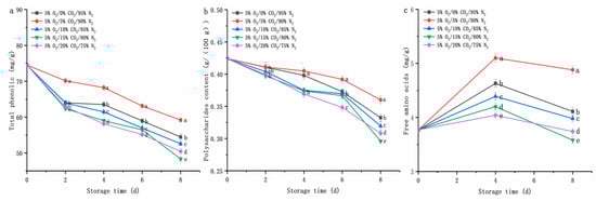 Effect of CO2 concentration (%) with 5% O2 on total phenolic (a), polysaccharides content (b), and free amino acids (c) of fresh-cut Dictyophora rubrovolvata. Differences at p < 0.05 are indicated by different letters and data are expressed as the mean ± SD.