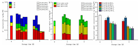 The combined action of 5′-nucleotides and umami amino acids (Asp and Glu) enhanced the umami flavor of the edible fungi [29]. In general, EUC represents their synergy. According to Figure 6c, the EUC values of a sample under a 5% O2/5% CO2/90% N2 gas environment (9.43 ± 0.33 g MSG/kg) at eight days are significantly higher than those observed in other storage environments (4.79 ± 0.17 to 7.96 ± 0.11 g MSG/kg), and approximately 1.18 to 1.97 times higher than those of the fruiting bodies (p < 0.05).