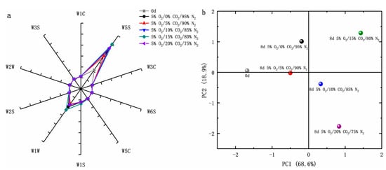 The E-nose is sensitive to odor information obtained from the food samples, and slight changes in volatile compounds will cause different sensor responses. A radar chart was used for the statistical analysis to illustrate relationships and trends among variables. There was consistency in the signal values of the appearance change of 10 sensors during storage in these samples. However, significant differences were observed not only between the radar profiles of the samples of D rubrovolvata on days 0 and 8, but also between the edible fungi treated with different treatments, indicating that the volatile compounds in the samples changed significantly during the shelf life (p < 0.05). On the eighth day, the response value profile of the 5% O2/5% CO2/90% N2 treatment group was the most similar to 0 d. This indicated that the volatile components were the closest to the initial level (Figure 7a). With the increase in CO2 concentrations (10%, 15%, or 20%) in the storage environment, there was an obvious deviation between the response value profile of the samples and initial value. Figure 7b shows the results of the PCA analysis. On the eighth day, the distribution of D. rubrovolvata compared with the initial day could be observed by PCA under various conditions. The variance contribution rates of PC1 and PC2 were 68.6% and 18.9%, respectively. The first two PCs were 87.50% (more than 85%), which could determine most of the volatile substance information of the sample. At 8 d, the fruiting body under a 5% O2/5% CO2/90% N2 environment compared with other samples was closest to initial level, and with an increase in the CO2 concentration in the storage environment, the difference from initial level was increased. As shown in Figure 6c and Figure 7, compared with other treatments, 5% O2/5% CO2/90% N2 not only delayed the decline of sample EUC, but also preserved its odor.