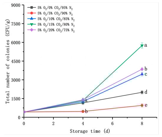 In general, CA with 2–5% O2 or CO2 was applied for fresh-cut products, which reduced the respiration rate and the growth rate of microorganisms [39]. Waghmare et al. [40] found that low O2 combined with a suitable storage environment for CO2 could effectively inhibit the growth of microorganisms in fresh-cut coriander. Consistent with the trend in the decay rate and respiration rate (Figure 2a,b), the total colony numbers of fresh-cut D. rubrovolvata gradually increased during the different gas environments for 8 d (Figure 8). Different treatments resulted in different rates of microbial growth. Interestingly, no microbial growth was observed in fresh-cut fruiting bodies after storage for 4 d at a CA of 5% O2/5% CO2/90% N2, whereas microbial growth was observed in the other treatment groups (p < 0.05). The total colony numbers were significantly lower (p < 0.05) in the fruiting body at 5% O2/5% CO2/90% N2 than the other groups, with values of 950 ± 141.42 CFU/g after eight days as compared to 2000 ± 141.42 to 5750 ± 212.13 CFU/g in other environments.