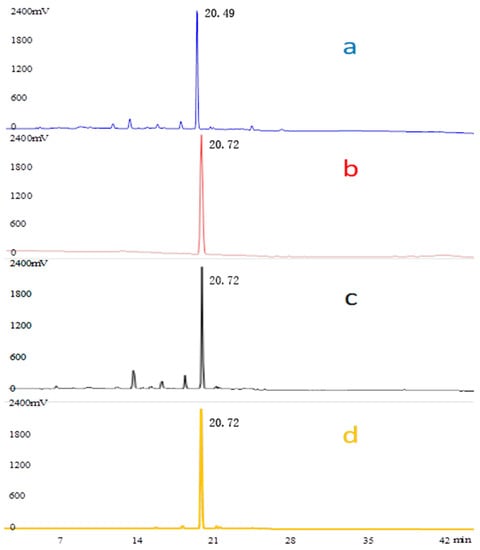 HPLC chromatograms. λ = 238 nm of the crude EGJ (a), the standard compound of geniposide (b), the 20% EGJ (c), and the No.4 sample (d).
