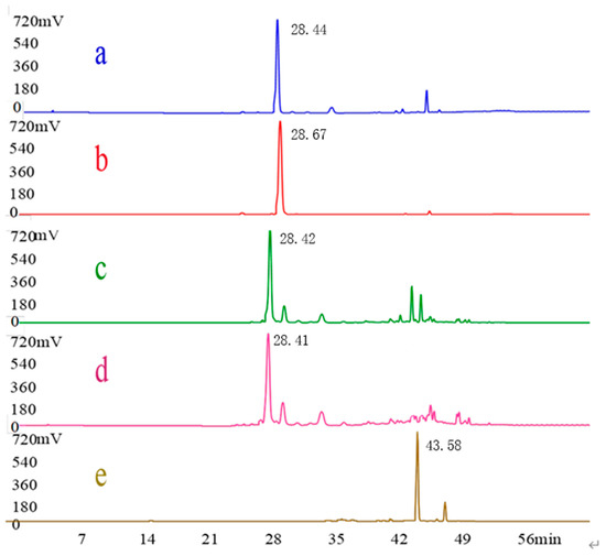 HPLC chromatograms. λ = 440 nm of the crude EGJ (a), the standard compound of crocin I (b), the No.8 sample (c), the No.9 sample (d), and the No.14 sample (e).