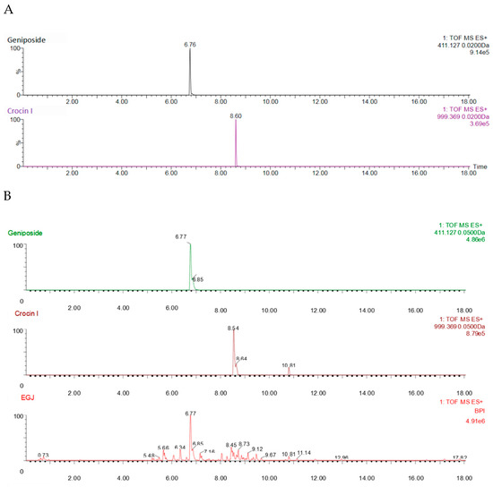 In addition, the structures of the geniposide and crocetin were identified following an optimized method [7,20,21]. To obtain the structure of the geniposide and crocetin in detail, the UPLC-ESI-QTOF-MS/MS system was performed on an ACQUITY UPLC instrument connected to a Xevo G2Q-TOF mass spectrometer via an ESI interface (Waters Corp, Milford, MA, USA). For the qualitative analysis, an analytical column (100 mm × 2.1 mm, 1.7 μm) was used to separate the complex fraction compounds. The injection volume was 5 μL, consisting of a 0.1% formic acid solution (A) and acetonitrile (B) as the mobile phase. The flow rate was 0.4 mL/min and the gradient elution conditions were 0 min, 1% B; 1 min, 1% B; 25 min, 99% B; 27 min, 99% B; and 30 min, 1% B. In the meantime, the column temperature was 30 °C, the voltage was 550 V, the dry gas temperature was 500 °C, the atomizing gas was N2, the pressure was 50 psi, and the mass-to-charge ratio was 50–1500 m/z.