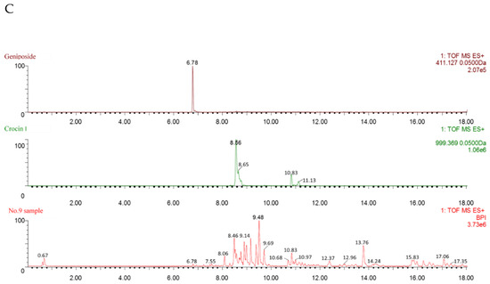(A) The geniposide and crocin I standards, (B) the crude EGJ, and (C) the No.9 sample.