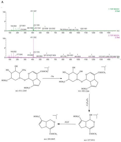 According to the primary and secondary mass spectra of geniposide, the mass-to-charge ratio (m/z) of geniposide with sodium ([M+Na]+) was 411.1267, the two geniposide couples ([2M+H]+) corresponded to 777.2850, the geniposide ([M+H]+) was 389.1268; the geniposide stripped of one molecule of monosaccharide ([M-glc+H]+) was the fragment ion 227.0921, and the geniposide stripped of one molecule of monosaccharide and one molecule of water ([M-glc-H2O+H]+) was 209.0805, as shown in Figure 4A. It was presumed that it was relatively easy for geniposide to remove one molecule of monosaccharide, followed by a further removal of one molecule of water from the parent nucleus of the cyclic enol ether terpene. Its mass spectrometry cleavage pathway is shown in Figure 4A.