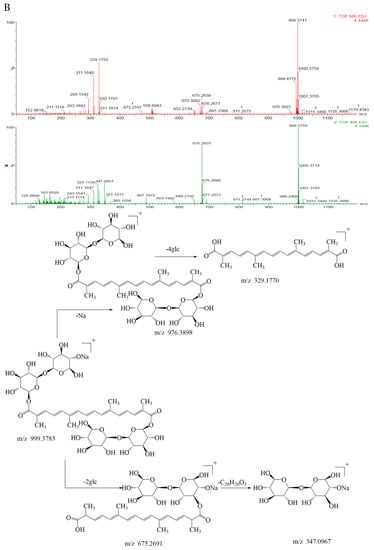 On the basis of the primary and secondary mass spectra of crocin I, the mass-to-charge ratio (m/z) of crocin I ([M+Na]+) with sodium ions was 999.3741, crocin I ([M+H]+) corresponded to 976.3801; crocin I with the sodium ions stripped of the disaccharides ([M-2glc+Na]+) was the fragment ion 675.2639, crocin I stripped of two disaccharides ([M-4glc]+) was 329.1755, and one molecule of disaccharide with the sodium ions ([M-2glc-C20H20O3]+) was 347.0957, as shown in Figure 4B. It was presumed that it was relatively easy to break the glycosidic bond attached to the parent chain from the disaccharide at both ends of crocin I. Its mass spectral cleavage pathway is shown in Figure 4B.