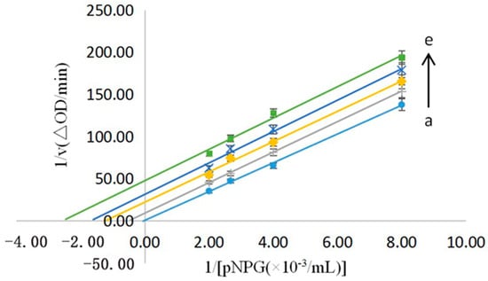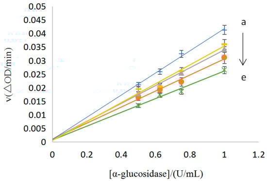 The enzyme kinetics of the reversibility of the No.9 Sample on the α−glucosidase [C(No.9) = 0.06, 0.08, 0.10, 0.12, and 0.14 mg/mL for the curves a→e, respectively].
