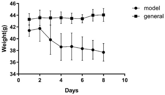 The weight changes of the mice after three days of the STZ injection were shown in Figure 8. The weight of the mice in the general group increased slowly while the weight of the mice in the model group increased on the second day and then decreased continuously. Until the eighth day, the weight of the model group dropped to 37.3 ± 1.6 g, while the weight in the general group increased to 44.0 ± 1.1 g. At the same time, the level of the blood glucose in the different groups was measured. The level of the blood glucose in the general group and the model group fluctuated between 4.67 mmol/L and 19.14 mmol/L, respectively. In addition, it was found that the hair of the mice in the general group was normal white and the mice were active, while the hair of mice in the model group w yellow, wet, and the mice behaved lazily, indicating that the DM modeling was successful.